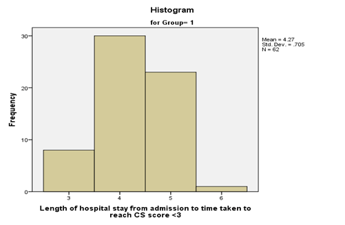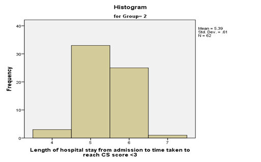 The mean length of hospital stay from admission to time taken to reach CS score < 3 was 4.83±0.077 days for the whole subjects investigated, and it differed significantly between the two groups: 4.27±0.90 days in Group 1 (Figure 1) and 5.39±0.610 days in Group 2 (Figure 2). An independent sample test conducted to examine whether there was significance difference between the effect of hypertonic group and normal saline group in relation to the days of hospital stay or not. A P value less than 0.001, revealed statistically significant difference in the lengths of time taken to reach CS score < 3 between the two groups (Table 1).