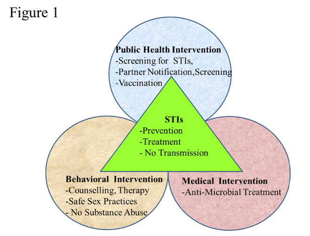 The optimal management for any person diagnosed with STIs should include comprehensive interventional strategy with three important components (Figure 1). The first component is of public health intervention constituting of screening for other STIs and HIV with follow-up repeat screening, early notification to the partner and screening. The second approach will be behavioral intervention constituting counselling and behavioral therapy including safe sex practices. The third component of this comprehensive strategy is therapeutic intervention constituting anti-microbial treatment not only for eradicating the disease process and reducing the risk of complications but also from public health perspective to halt the spread of infection in population.1-5 The primary prevention against STIs is via counselling and behavioral therapy. Such interventional program should include incorporating sex education in regular school and college curriculum with focus on comprehensive education on sexuality that is target towards teenage population. The counselling should also include safe sex practices such as correct use of condoms, reduction in risk taking behavior including substance abuse, along with counselling before and after screening test for STIs. The substance abuse such as alcohol, tobacco, marijuana, cocaine, and various other illicit drugs have been reported to be closely associated with teenage pregnancy and unplanned pregnancy with higher rate of STIs. The public health interventional program will also include providing vaccination to the target population against HPV and Hepatitis B virus. This approach can prevent long term complications of these infections such as gynecological malignancy. However, more biomedical and translational research needs to be done in future to develop safe and effective vaccines against other STIs.1-7