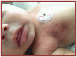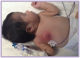 Term newborn, during her first hours of life, with suspicion of an early-onset sepsis without an isolated pathogen, discharged from the hospital the seventh day without complications. At eleven days of extrauterine life she presented with erythema, induration of the right mammary region and purulent secretion through the nipple, with 38°C fever and irritability, for which she was admitted to the NICU. Awake, reactive, irritable, with right breast volume increase, local temperature increase, erythema, and purulent secretion through the nipple for the second time. Multiple cultures were made and a vancomycin/cefotaxim antimicrobial regimen was given for 14 days. Surgical drainage was necessary and she was discharged with total resolution of her condition (Figure 1) (Figure 2).