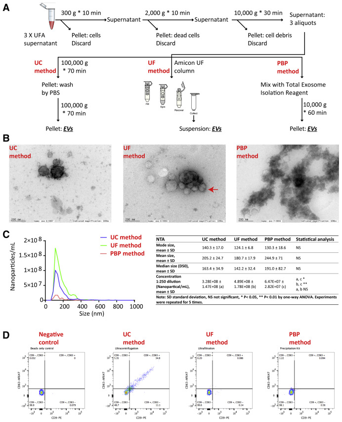 EVs, extracellular vesicles; FACS, fluorescence-activated cell sorting; NTA, nanoparticle tracking analysis; PBP, polymer-based precipitation; PBS, phosphate-buffered saline; TEM, transmission electron microscopy; UC, ultracentrifugation; UF, ultrafiltration.