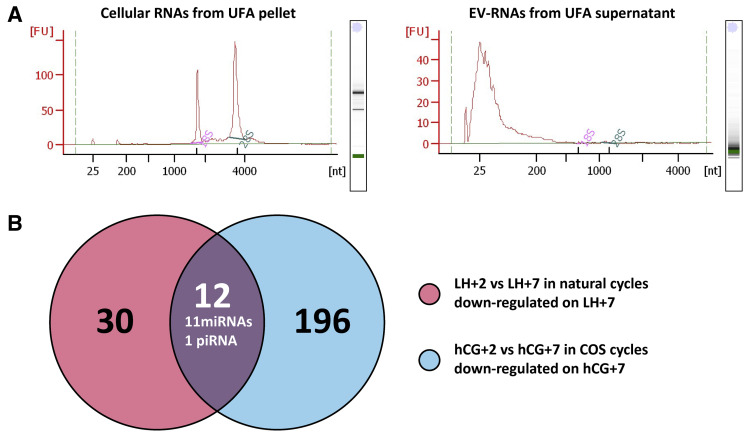 Figure 2 Courtesy ref no-8-Identification of receptivity-related snoRNAs from EVs. (A) A representative set of bioanalyzer traces showing enriched small RNAs extracted from EVs. (B) Venn diagram cross referencing down-regulated sncRNAs during the receptive phase in natural and COS cycles.