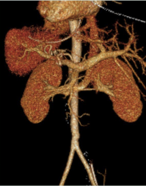 AMVS, 47 years-old, female, BMI 42.2 Kg/m2, without previous abdominal surgeries, proposed to be submitted to a segmentar colectomy after 2 acute diverticulitis episodes in a 6 months period, in a district hospital without vascular surgery support, on the 17/3/2021. As soon as the Verress needle was inserted, blood was immediately seen. A trocar was inserted periumbilically and an inframesocolic retroperitoneal hematoma was seen. The surgeon tried to control the hemorrhage unsuccessfully and had to convert to laparotomy. He then proceeded to clamp the aorta artery and transferred the patient to a terciary hospital. The vascular surgery team who received the patient performed an aortoplasty with a Safenous Magna Vein patch and trombectomy of the iliodistal arteries (Figure 1 shows a CT reconstruction of the Aorta artery). The time between the iatrogenic lesion and the vascular intervention was 2 hours.