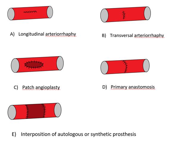 Injuries of major vessels normally requires team work between the anestesiologist, to hemodynamically stabilize the patient, and the surgeon, to control the bleeding. Against small hemorrhages that can be controlled laparoscopically, hemorrhages from abdominal major vessels requires a quick conversion to open surgery, with the favorite incision being the median/externopubic incision, and manual or clamping control of the vessel. If the endoscopic surgeon as experience in vascular surgery, he can perform a complete vascular repair. If he has no experience in vascular trauma, a vascular surgeon must be called or, if there are none, transfer to another hospital with vascular support must be carried out to complete the vascular repair (arteriorraphy, patch arterioplasty- as done in our case-, section of the arterial lesion and primary anstomoses or implantation of autologous or syntectic grafts (Figure 3). The treatment of the venous lesion should favor venous reconstruction and avoid ligation, which should only be performed in extreme situations to avoid future sequelae. After the repair is done, the treatment continues in an intensive care unit to correct the sequelae of bleeding, the transfusions if needed, and detect and prevent complications and promote their correction.
