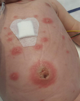 A 39-day-old female patient with no relevant perinatal history came to the emergency department with fever up to 37.8ºC and an irritability period of 24 hours. On evaluation she presented a good general condition and an unremarkable physical examination. Complementary tests showed Hb 9.3 gr/dl, leukocytes 21,700, neutrophils 58.2%, lymphocytes 25%, C-reactive protein (CRP) 1.71 mg/dl and leukocyturia. The patient was admitted for febrile urinary tract infection due to ampicillin-sensitive Escherichia coli with normal renal ultrasound, initially treated with ampicillin and gentamicin. After 48 hours of admission, the patient showed vesicular-pustular lesions with erythematous base starting in the periumbilical region with subsequent generalization (Figure 1), as well as bilateral conjunctival exudate, liquid stools and rhinorrhea, persisting with high fever peaks and remarkable irritability, so antibiotherapy was rotated to cefotaxime and gentamicin, and treatment with acyclovir was added. Lumbar puncture was performed without significant findings. After 24 hours the patient remained febrile and showed clinical worsening with acute respiratory failure and signs suggestive of sepsis, so he was admitted to the Pediatric Intensive Care Unit (PICU).