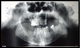 A 65 year old male patient reported to the outpatient department of Periodontology, SGT Dental College, Budhera with the chief complaint of bleeding gums, mobility of teeth and difficulty in mastication since one month. Patient also complains pain in relation to right back tooth region for 2 weeks. Pain was sharp in nature, aggravated on lying down, relieved by taking medication and was not referring to any other site. Patient gave past medical history of PCV since 2003 and on being medications for the same which included: Hydroxyurea- 500 mg twice daily as cytoreductive agent to decrease the leukemogenic risk and ecosprin -75 mg (low dose aspirin) to lessen the risk of thrombosis in an artery. Cimetidine was given (H2 receptor antagonists) to relieve gastrointestinal symptoms of peptic ulceration. Citrezine (antiallergic) was prescribed to relieve generalized itching which patient was suffering from. On intra-oral examination it was found that there was mobility present in relation to all the teeth, red inflammed gingiva with loss of stippling which bled profusely on slight provocation, generalized recession, gingival enlargement present in relation to all the teeth, attrition and root caries present in relation to 45. Patient was advised Orthopantogram (OPG) which showed generalized horizontal bone loss extending upto two third of root surface of almost all the teeth present (Figures 1&2).