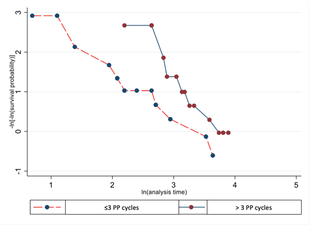 The in-hospital survival function for the event of interest was measured using a non- parametric model (the Kaplan–Meier estimator) by groups according to the number of PP cycles (first group for patients who received ≤ 3 cycles and the second group for those patients who received > 3 cycles). Log-rank and Wilcoxon tests were used to find differences between these survival curves.
