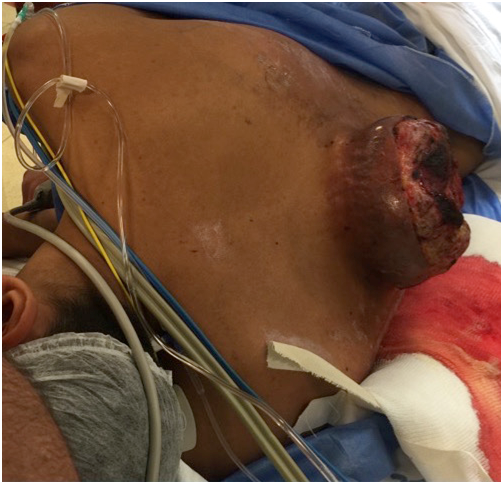 A 17 years old male patient presented with a progressively enlarging back tumor of six months duration, prompting him to wear jackets and backpacks to conceal it from others. He had intense, continuous pain in the region, and an inability to lie down in a supine position.