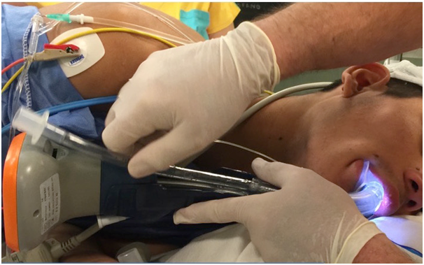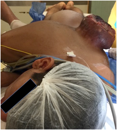 There were no predictors related to any difficulty for mask ventilation, supraglottic device usage, direct laryngoscopy or video laryngoscopy, except – it was impossible for him to adopt a supine position, and in fact, he had to be angled at more of a lateral decubitus than normal 90 degrees. Our preference was for the left side down (in case direct laryngoscopy was needed, so that the tongue would fall downward and away from the right side of the mouth) (Figure 2). The patient was scheduled for surgical reduction of the mass to improve his level of comfort.