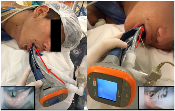 The Video Laringeal Mask is a new device with a bimodal functional concept to control the airway in different clinical scenarios. The initial operating mode is called “Mask” and the secondary is “Intubation.” It is interesting to note the ability to operate in mask mode ventilation and oxygenation may be possible at the same time as the ability to view continuously, the airway and laryngeal structures, and to facilitate the final tracheal intubation.