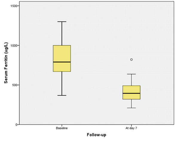 In this analysis, we found that the pulse oximetry measured at 7 days of evolution was significantly higher compared to the pulse oximetry measured in the baseline evaluation [88.0 (86.0 - 89.0)% VS 94.0 (93.0 - 95.0)%; p=0.001)] (Figure 1A). On the other hand, the median d-dimer and ferritin in serum measured at 7 days of follow-up, were significantly lower compared to the medians of the measurements of these biomarkers that were performed in the baseline evaluation [1,200 (990.0 - 1,800.0) ng/mL VS 656.0 (497.0 - 697.5) mg/mL; p = 0.001] and [790.0 (670.5 - 1,000) ug/mL VS 394.5 (320.0 - 492.5); p=0.001), respectively (Figures 1B and 1C).