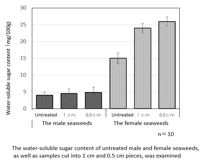 Water-soluble sugar content of male and female seaweeds: The water-soluble sugar content of untreated male and female seaweeds, as well as samples cut into 1 cm and 0.5cm pieces, was examined (Figure 2). The sugar content in female seaweeds was approximately 4 to 5 times higher than that in male seaweeds. In male seaweeds, there was little difference in sugar content between untreated and finely chopped (0.5cm) samples. However, in female seaweeds, finely chopping to 0.5cm significantly increased sugar content—approximately 1.7 times higher than in untreated samples. These results confirm that finely chopping female seaweeds allows for greater extraction of water-soluble sugar.