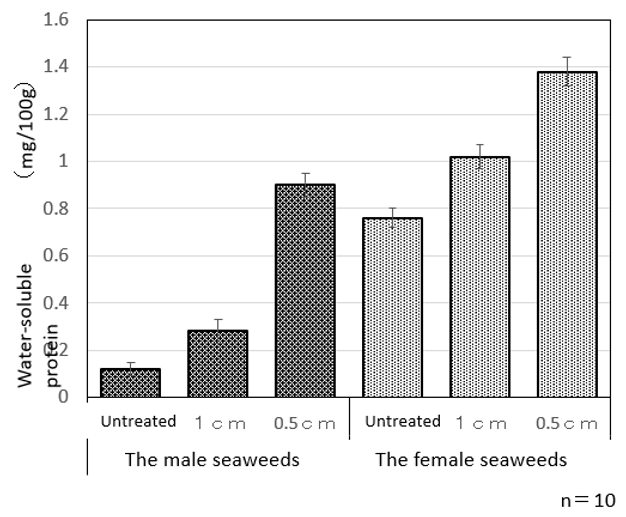 Water-soluble protein amount in male and female seaweeds: Water-soluble protein content was also measured in untreated male and female seaweeds and samples chopped to 1 cm and 0.5 cm (Figure 3). Similar to the sugar content, female seaweeds contained about 1.5 to 5 times more water-soluble protein than male seaweeds. Unlike the trend observed in sugar content, chopping increased protein extraction in both male and female seaweeds. Specifically, more protein was extracted from samples chopped to 0.5cm than from untreated samples, with female seaweeds showing particularly high extraction levels when finely chopped.