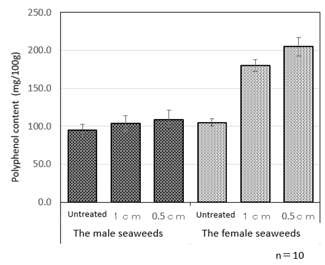 Polyphenol content of male and female seaweeds: The polyphenol content of untreated male and female seaweeds, as well as samples cut into 1 cm and 0.5cm pieces, was examined (Figure 4). Polyphenol content was higher in both male and female seaweeds when cut into smaller pieces compared to untreated samples. Additionally, female seaweeds contained approximately 1.5 to 5 times more polyphenols than male seaweeds. From these results, it was expected that the antioxidant function would be enhanced by cutting into finer pieces.