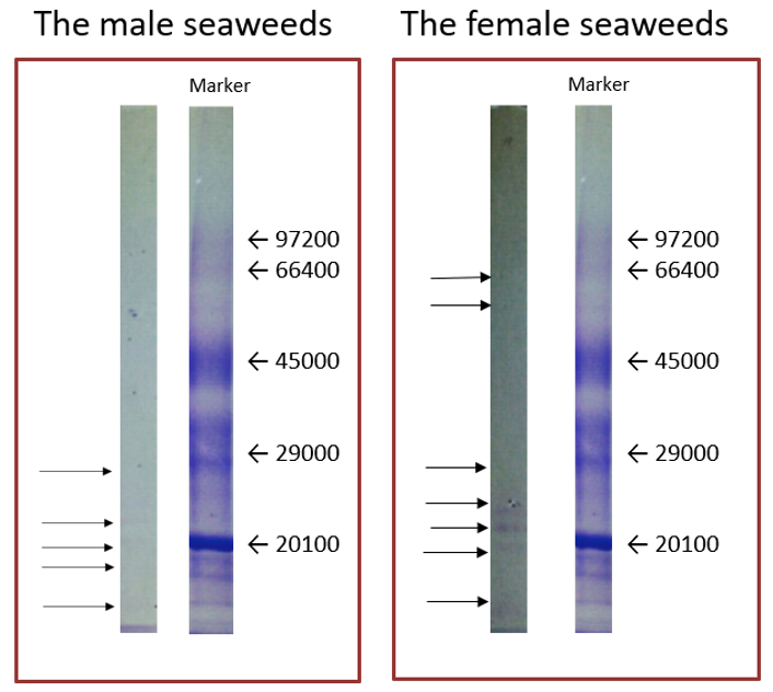 Molecular weight distribution of water-soluble proteins in male and female seaweeds by electrophoresis: The molecular weight distribution of extracts obtained from male and female seaweeds chopped into 0.5 cm pieces was analyzed using electrophoresis (Figure 5). Proteins with higher molecular weights were detected in female seaweeds compared to male seaweeds. Specifically, the main molecular weight range was 25,000 to 14,000 for male seaweeds and 66,000 to 14,000 for female seaweeds. Female seaweeds were also found to contain more mucilage, along with greater amounts of water-soluble sugar and protein, suggesting the presence of glycoproteins. This component warrants further investigation in future studies.