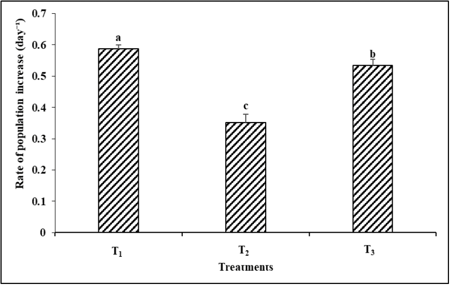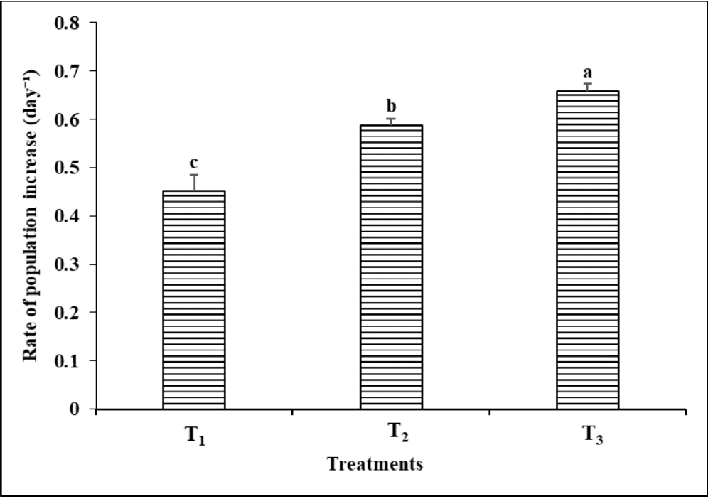 Food type showed a highly significant (P< 0.05) impact on the population growth rate (r) of B. calyciflorus (Figure 6). The food types considerably altered the population growth rate (r) for B. calyciflorus, which was 0.587 ± 0.01, 0.35 ± 0.02, and 0.53 ± 0.01 day-1 in T1 (live Chlorococcum sp.), T2 (baker’s yeast), and T3 (a combination diet of live Chlorococcum sp., + baker’s yeast) respectively.