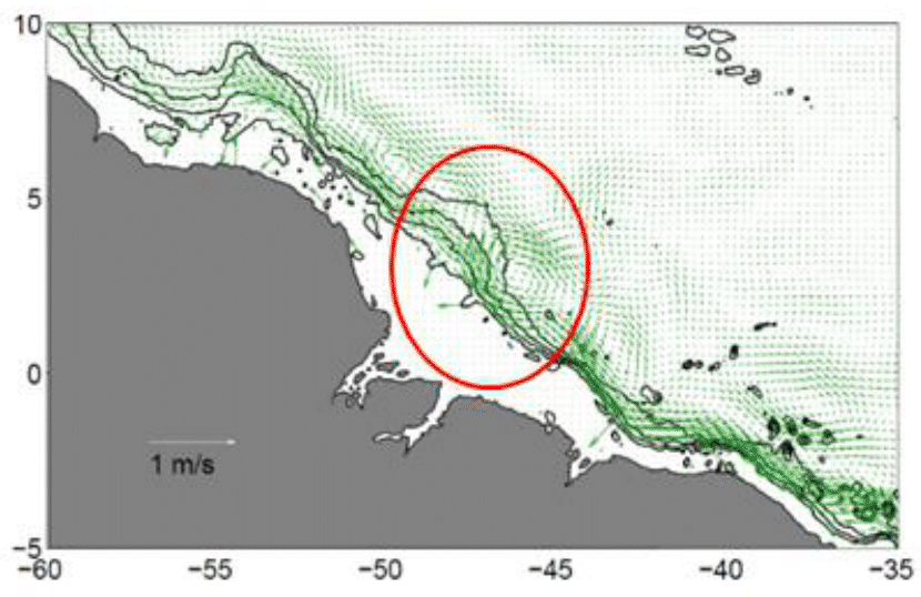 Here we show Benthic living Buccella peruviana, Peneroplis carinatus, P. pertussis, and the planktonic Globigerina rubra are directly associated with organically enriched sediments, and carbonate production where offshore vortices are likely to occur. The sedimentation pattern derived from vorticity dynamics is evidenced by the deposition in one side and erosion in the other side on its forecasted pathway. Therefore, local vortices in thermocline associated with the upwelling of cold waters in canyon heads on the Brazilian Equatorial shelf might be responsible for maintaining remains of living coral-algal systems on mesophotic outer shelves such as the Açu Reef (Figure 1).2