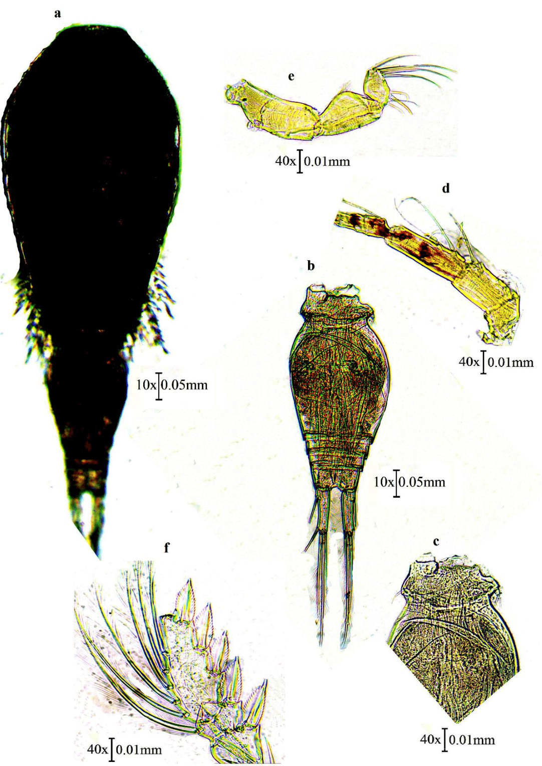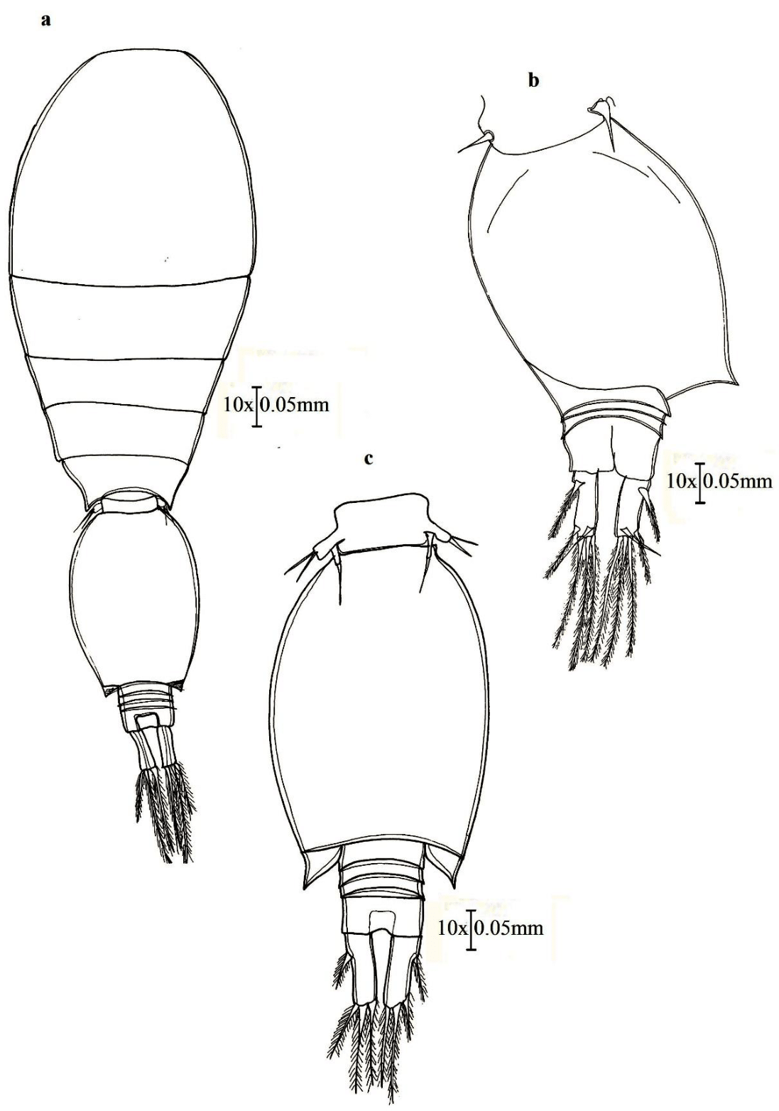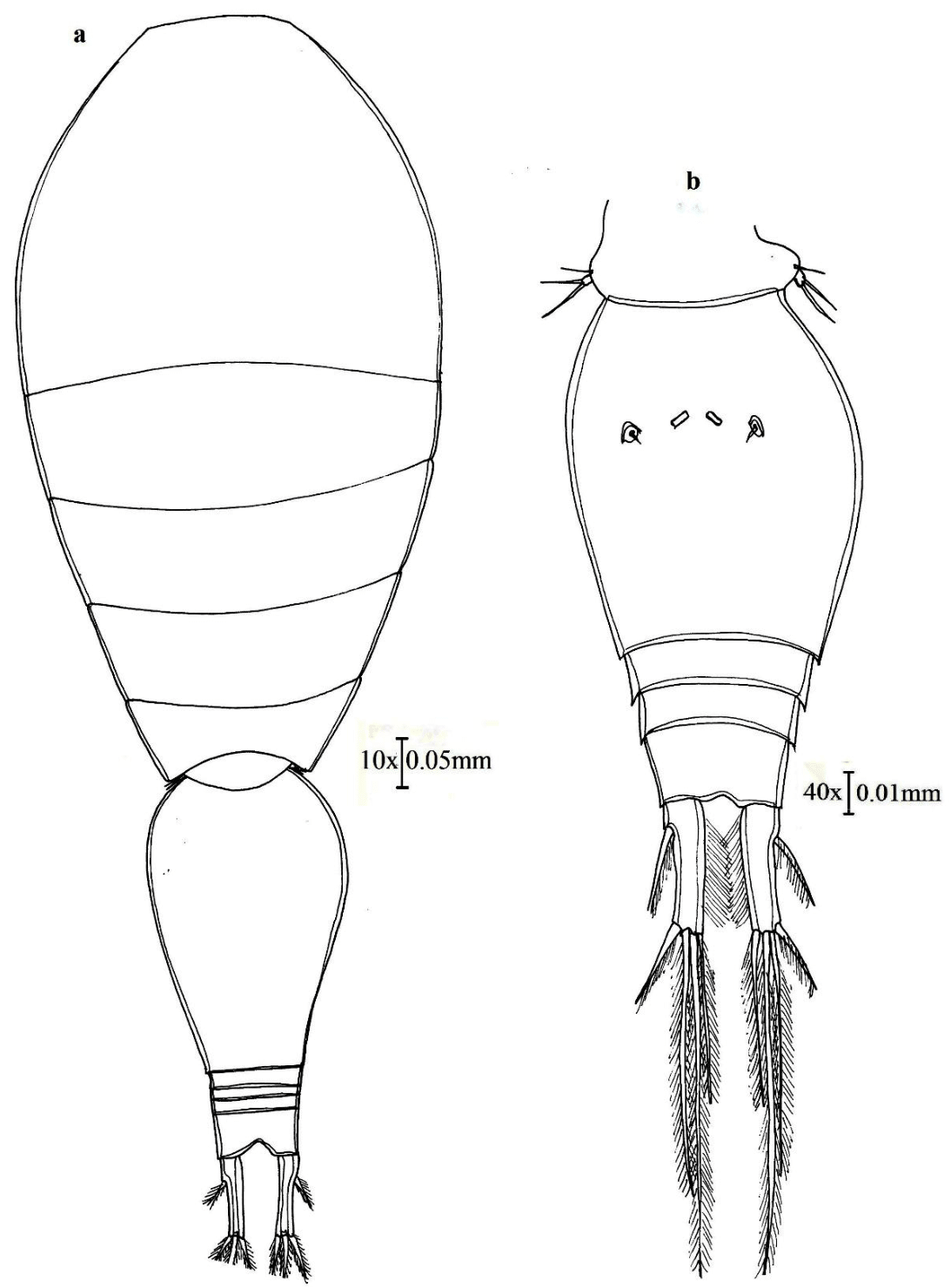 Female: Total length 1.27-1.38mm.Prosome 1.72 times as long as wide and 1.81 times longer urosome (Figure 2a & 3a). A1 six-segmented (Figure 3d).Urosome five-segmented (Figure 2b and 3b), 2.04 times as long as wide.GS 1.56 times as long as wide. CR 1.25 times as long as wide. Proportional lengths of the urosomal somites starting with 5th thoracic segment (+CR) is 0.9:7.6:0.3:0.3:1.2:2.