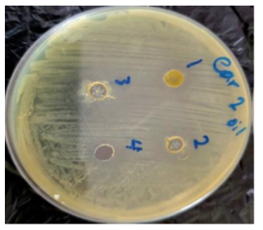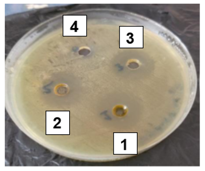 Figure 1 Inhibition zones produced by ether clove (Syzygium aromaticum) extract (wells 1–3: 25%, 50%, and 100% concentrations, respectively) and negative control (well 4: 10% DMSO) against Proteus spp. on Mueller–Hinton agar.