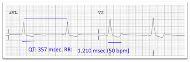 The PR interval length is lesser than 120 milliseconds (short PR, intermittent delta wave). The QT length is lesser than 360 milliseconds (357 milliseconds), The RR-interval length is 1,224 milliseconds (50- beats per minute). The QTc length is lesser than 350 milliseconds: