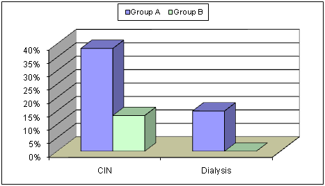 There was also a statistically significant difference between the two groups regarding the estimated GFR of maximum creatinine during hospital stay, (74.5+34.9 ml/min in group A vs 90.5+31.4ml/min in group B) (p<0.05). The timing of peak creatinine during hospital stay was nearly equal in both groups with no statistically significant difference (3.8+0.8 day in group A vs 3.5+0.5 day in group B) (p> 0.05). There was a highly statistically significance difference regarding the incidence of CIN and need for dialysis between both studied groups, where CIN occurred in 23 (38.3%) patients, of which 9 patients required dialysis in group A, while in group B, CIN occurred in 8 (13.3%) patients, none of which needed dialysis (p < 0.01).