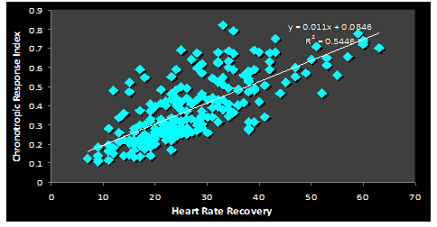 More recently, the mechanisms responsible for post exercise HRR have been challenged, even contesting its prognostic value.13 Thus, currently it seems that the HRR requires further investigation and refinement before the definitive criteria for its clinical use and interpretation can be adopted. The results of the study show a significant correlation among the chronotropic variables and Heart Rate Recovery which is in accordance to the available literature. These results underlie the assumption that, both the coefficients are dependent on the autonomic nervous system. The cardiac acceleration during exercise and deceleration after exercise is thought to involve an interplay between the two limbs of the autonomic nervous system, which points towards the possibility of the “accentuated antagonism” suggesting that the activity of one limb of the autonomic nervous system is directly related to the activity of the other limb.18 Though, different physiologic mechanisms are responsible for these initial and final HR transients. The rapid initial HR transient is exclusively mediated by vagal inhibition. On the other hand, the physiological mechanisms involved in the postexercise transient are unclear. Though, the reduction in the adrenergic component seems to play a greater role in the subsequent HR decrease. Thus, it may be concluded that the information obtained from both the transients is complementary.7