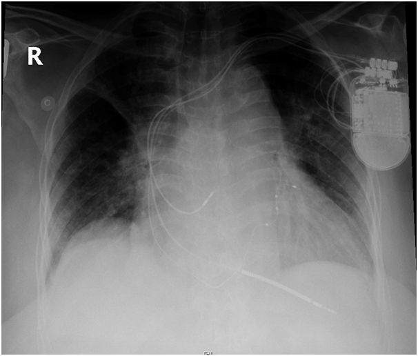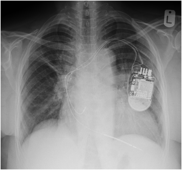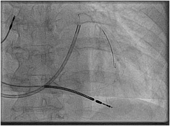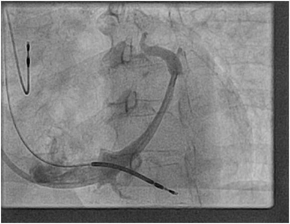 We were asked to see the patient, we reviewed her previous CXR post CRTD implantation and was (Figure 1) reviewed her procedure note which advocated the difficulty in securing LV lead deeply through lateral vein of the heart due to significant branch stenosis. The lead was then implanted in the posterolateral CS branch. Then, we requested a new CXR which showed the device slightly lower than implant position and displacement of LV lead higher in SVC (Figure 2).