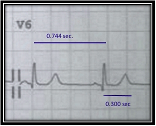 RR interval= 0.750 seconds. (HR. to 80 bpm, approx.)