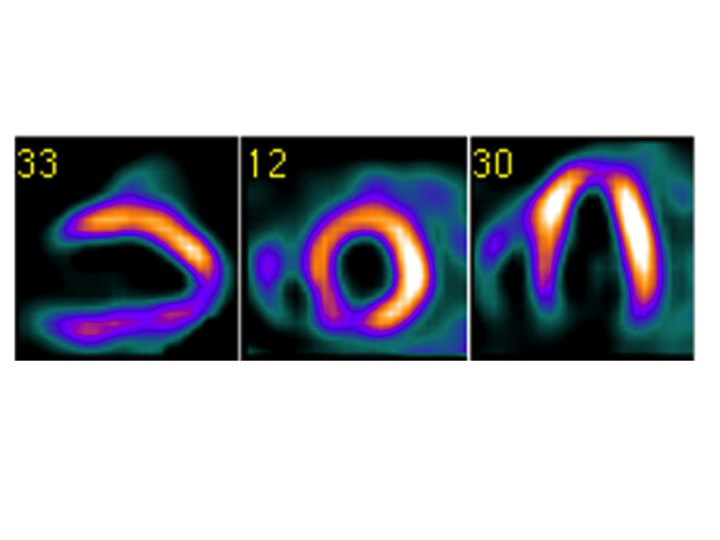 The initial test performed was an echocardiogram that showed a non dilated left ventricle with mild concentric hypertrophy, preserved LVEF (left ventricle ejection fraction) with normal wall motion, diastolic dysfunction (alteration of the ventricular relaxation). Valvular morphology and function were normal. We then decided to perform a SPECT stress test on a cyclo-ergometer, that showed development of significant hipoperfusion in all inferior wall segments with extension to posterior wall (Figure 2) with partial recovery with rest (Figure 3). During the test, the patient developed progressive dyspnea and vegetative symptoms that disappeared with rest. Following these results, a coronary catheterization was indicated. Left main coronary artery had no significant lesions, circumflex artery had a non severe lesion in the second marginal branch and the right coronary artery was chronically occluded in the proximal segment, with the presence of collateral circulation (Rentrop 3). SYNTAX Score was 12 points.