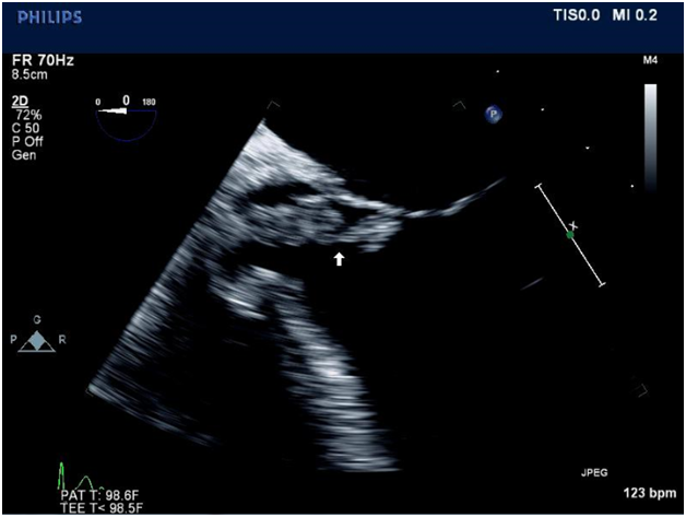 A 21-year-old female patient was admitted for further evaluation of severe acidosis and unresponsiveness. Trans-esophageal echocardiography demonstrated a large aortic valve vegetation (Figure 1) and severe aortic regurgitation. The patient was diagnosed with native aortic valve Staphylococcus aureus endocarditis and multiple cerebral intra parenchymal hemorrhages, bacterial meningitis, and Hepatitis C. Within hours of admission the patient developed severe heart failure, complete heart block, and pulmonary edema requiring mechanical ventilation and cardiopulmonary resuscitation. She was immediately taken to the operating room. Intra-operative trans-esophageal echocardiography revealed a sinus defect of the non-coronary sinus of Valsalva, a rupture of the sinus of Valsalva abscess into the right atrium with fistula formation and a new large vegetation at the tricuspid valve (Figure 2). Emergency surgery was carried out through median sternotomy with total cardiopulmonary bypass and venous drainage of the snared superior and inferior vena cava. The heart was arrested with hypothermic crystalloid cardioplegia, which was infused directly into the right and left coronary artery. Destroyed intra- and peri-annular areas from the atrial side and aortic area of the non-coronary sinus were closed with glutaraldehyde pre-prepared autologous pericardial patches. After debriding the abscess, repairing the fistula, and reconstructing the peri-annular defects, the annulus was re-examined and sized for replacement of a bio prosthetic artificial aortic valve. Twelve pledgeted 2-0 Tevdek sub-annular mattress sutures soaked in Linezolid were passed through the area reconstructed by pericardial patch and aortic annulus and through the sewing ring of a 19mm tissue aortic valve bioprosthesis. A diamond-shaped pericardial patch was placed in a supra valvular position near the superior vena cava, which assisted in a tension-free closure of the near circumferential aortotomy. Mean effective orifice area ratio measured 1.02cm2/m2. A completion trans-esophageal echocardiography revealed a functioning and competent bioprosthetic aortic valve, no evidence of paravalvular leakage, correction of the aorto-right atrial fistula, and an overall well-preserved left and right ventricular function. Prior to discharge, a permanent pacemaker was implanted.
