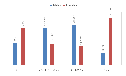 In the present study CHF among women was found to be higher than men and such findings were previously reported.27 Heart attack was significantly higher among males in the current study. It was well established that heart attack is more frequent among males compared to females.28 Coronary heart disease (CHD), conventionally regarded as a male disease, but responsibly of high incidence of deaths in women. The prevalence of CHD is lower in women at all ages, and the clinical outcomes such as myocardial infarction mortality, worse in women with CVD than in men.29 Stroke was more common among males in this study, which was similarly reported in some studies.30 but some studies from Japan reported reverse results.31 PVD was also found to be more among females than males, which was previously reported.32 However, PVD was also reported more common among men compared to women.33