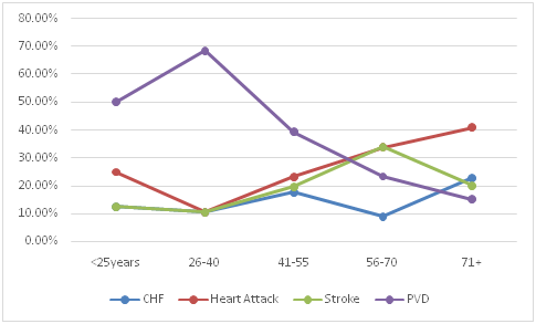 Of the 27 cases of CHF, 10/27(37%) were males and 17/27(63%) were females. The risk of CHF is more associated with females than males and this relationship is statistically significant (P < 0.05). Of the 52 cases with heart attack, 33/52(63.5%) were males and 19/52(36.5%).The risk of heart attack is more associated with males than females and this relationship is statistically significant (P < 0.006). Of the 41 cases with stroke, 28/41(68.3%) were males and 13/41(31.7%).The risk of stroke is more associated with males than females and this relationship is statistically significant (P < 0.001). Of the 58 cases with PVD, 12/58(20.7%) were males and 46/58(79.3%).The risk of PVD is more associated with females than males and this relationship is statistically significant (P < 0.0001), as indicated in Table 2 and Figure 2.