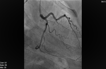 A 32 years young woman with history of hypertension, dyslipidaemia and active smoking, presented to the Emergency Department of our hospital with symptoms of unstable angina pectoris. The patient was a diagnosed case of Mid-Aortic-Syndrome with bilateral renal artery stenosis (2000) and underwent resection of the stenotic intermesenterial aortic segment with implantation of PTFE-Prosthesis and bilateral implantation of renal arteries at the very young age of 12 years. Her physical examination was unremarkable with no evidence of dyspnoea, lung congestion, murmurs or signs of raised jugular venous pulse (JVP). Her heart rate was 76 bpm and the blood pressure was stable at 130/80 mm Hg. Her daily medication was Aspirin 100 mg, Candesartan 32mg, Bisoprolol 7.5mg and Atorvastatin 40mg. An electrocardiogram (Figure 1) on admission demonstrated sinus rhythm with early repolarisation changes and laboratory analysis revealed normal blood count with normal liver and kidney functions. Initially, the cardiac biomarker (Troponin T) was 34pg/ml (normal range < 14 pg/ml) but follow up results showed a significant rise from 34pg/mL to 661 pg/mL. With the diagnosis of an acute myocardial infarction on the basis of a sudden exponential change in the Troponin levels, the patient underwent coronary angiography through the right femoral artery route (Figure 2), which revealed a disease free left main coronary artery. We were unable to identify the RCA ostium, for which an Aortography was performed and it revealed the RCA originating from left coronary sinus. Further confirmation of the anomality was done through a coronary computed tomography angiography (Figure 3). The coronary computed tomography angiography (CCTA) showed the anomalous origin of a hypoplastic RCA from left coronary sinus ventral to the left main origin, lying between the aorta and the pulmonary trunk with a negative Agatston score. The transthoracic echocardiogram revealed a normal left ventricular function without any regional wall motion abnormalities, diastolic dysfunction Grade II and minimal mitral- and tricuspid-regurgitation. Laboratory investigation for cardiotropic virus marker revealed increased values of IgG-EBV, which most probably reflects an old Epstein-Barr virus (EBV) Infection.