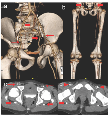 Figure 1 CT Angiography volume rendered images in anterior (a) and posterior projections (b) showing bilateral persistent sciatic arteries continuing as internal iliac arteries and coursing through the bilateral sciatic foramina (thick arrows) which are supplying the entire vascular axis of the leg (complete SPAs). The external iliac artery is continuing as CFA (thin arrows) which are continuing as incomplete superficial and profunda femoris arteries. Axial CT angiographic images at level of femoral head (c) and neck of femur (d) show posterior course of PSAs in the gluteal regions (thick arrows). The external iliac (thin arrows) and the profunda femoris (arrowheads) arteries are anterior and normal in course.