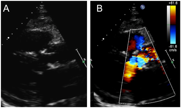 Figure 1 Parasternal long axis transthoracic echocardiogram (A) demonstrating thickened aortic valve leaflets with a stenotic valve on colour flow Doppler (B).