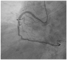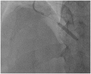 A 66-year old male with long standing history of type 2 diabetes, hypertension, dyslipidaemia and ischemic heart disease with prior history acute myocardial infarction treated with primary PCI to LAD with 3.0x22 mm drug eluting stent. Came for a staged PCI for a significant proximal RCA lesion. Following obtaining an informed consent and reload with 300 mg of Plavix. Right radial approach was selected patient received 7000 units of heparin. A 3DRCguidingcatheter was used to intubate the RCA following failure to engage with Judkin 4 guiding catheter, BMW wire advanced all the way to the distal end of RCA, lesion predilated by2.5x15mm compliant balloon to 12 atmospheres (Figure 1). A 3.5x 22mm Xience expedition stent was placed across the lesion under fluoroscopy. It was noted that the guide was not stable. It was decided to deploy the stent with the first fluoroscopy the stent appeared to have dislodged into the ascending aorta with the wire (Figure 2). Now the stent with an inflated balloon the guiding catheter and the wire all hanging in the ascending aorta. The initial decision to remedy this was to carefully and slowly withdraw the entire system along the course of the subclavian system and deploy the stent in a safe spot (Figure 3). But because of tortuosity it was thought to snare the entire system through a large femoral sheath. An 8 Fsheath was inserted into the right femoral artery and a 6 F ensnare system taken to the ascending aorta and grabbed the inflated balloon (Figure 4) and stent slowly moved down into the abdominal aorta under fluoroscopy. Then the balloon was deflated slowly and the snare tightened across the stent (Figure 5) and taken outside the body through the 8 F sheath (Figure 6) post snare femoral angiogram showed no injury to the femoral artery and a successful snaring of the dislodged stent. Patient was brought at alater date for a successful direct PCI to the RCA. This time the guide selected was an Amplatzer 0.75 (Figure 7).