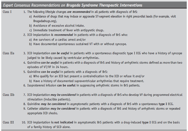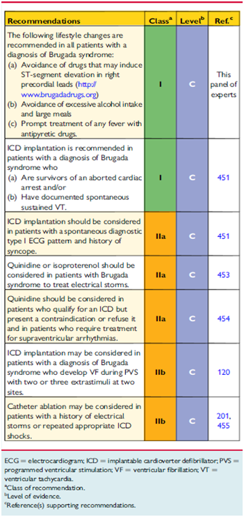 In 2015 ECS has published new guidelines for the management of patients with ventricular arrhythmias and prevention of sudden cardiac death, in which Brugada Syndrome is mentioned too. Brugada syndrome is diagnosed in patients with ST-segment elevation with type 1 morphology ≥2mm in one or more leads among the right precordial leads V1 and/or V2 positioned in the second, third, or fourth intercostal space, occurring either spontaneously or after provocative drug test with intravenous administration of sodium channel blockers (such as ajmaline, flecainide, procainamide or pilsicainide). ESC recommendations suggest the ICD as the only treatment able to reduce the risk of SCD in Brugada syndrome, thus the appliance can be applyed in patients both with documented VT or VF and in patients presenting with a spontaneous type 1 ECG and a history of syncope12 (Table 1).