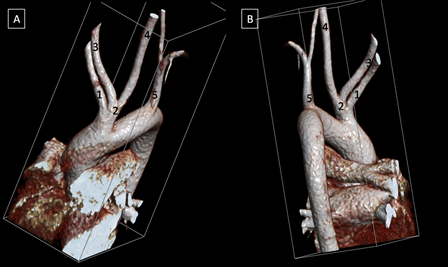 Figure 1 Volume rendered CT images (A-B) showing common origin of right subclavian artery and bicarotid trunk in two branch vessel left aortic arch. 1-right subclavian artery. 2-bicarotid trunk, 3-right common carotid artery, 4-left common carotid artery, 5-left subclavian artery.