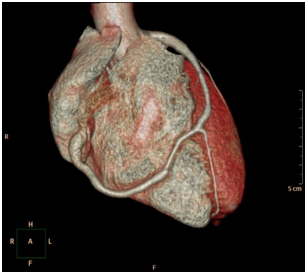 There was an arterio-venous fistula, arising from the distal LAD with an unclear drainage end into the right heart chambers (Figure 3) (Figure 4). There was a slow flow in the distal LAD beyond the fistula origin. Her LAD was type III, wrapping around the left ventricular apex, supplying the apical two-thirds of infero-posterior wall. The right coronary artery (RCA) was rudimentary and the left circumflex artery (LCx) was normal. To further study these abnormalities, she was scheduled for CT Coronary Angiogram which revealed a fistula arising from the distal LAD and courses anteriorly on the right ventricle measuring 3.3 mm just after its origin from the LAD, terminating into the superior aspect of the right ventricle (RV). The terminal part of the AV measures 11.8 mm (Figure 5) (Figure 6). The rest of the coronary findings were matching those seen in the conventional coronary angiography.