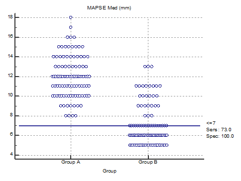 Figure 2 Interactive dot diagram for the cut-off point between normal and abnormal EF as regard to MAPSE at the Medial Mitral annulus.