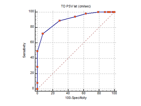 Mann-Whitney and chi-square tests were used to assess the baseline variables (age, gender, Risk factors). Receiver operating characteristic (ROC) curves and Interactive dot diagrams were plotted to examine the ability of MAPSE and PSV (Sm) to differentiate patients with impaired systolic functions (EF<50%) from those with normal systolic function, and sensitivity and specificity were determined accordingly. All analyses were done using MedCalc v14.8.1 by MedCalc Software.