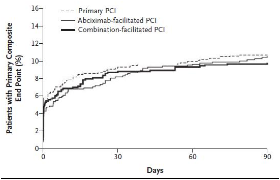 The composite end point in the FINESSE trial included death from all causes and complications of myocardial infarction from randomization through day 90. Data are shown for all patients randomly assigned to a treatment group. P=0.55 for the comparison of primary percutaneous coronary intervention (PCI) with reteplase-plus-abciximab–facilitated (combination-facilitated) PCI. P=0.86 for the comparison of primary PCI with abciximab-facilitated PCI. P=0.68 for the comparison of abciximab-facilitated PCI with combination-facilitated PCI.