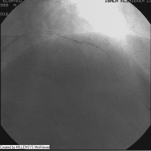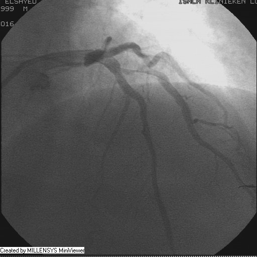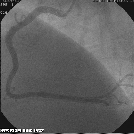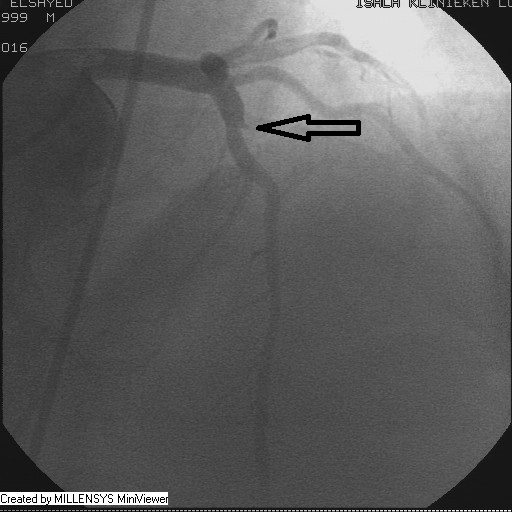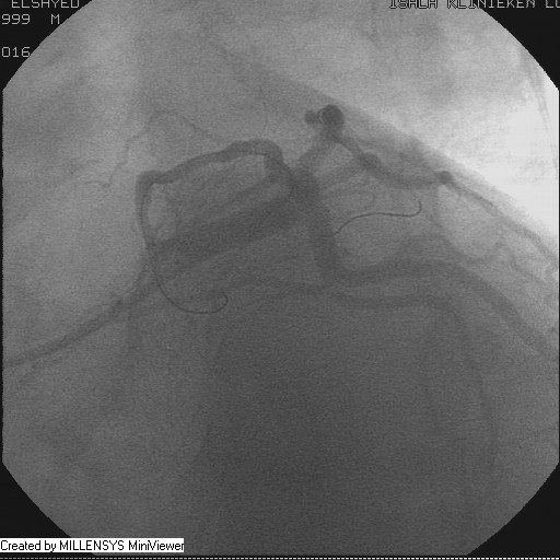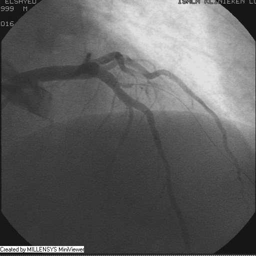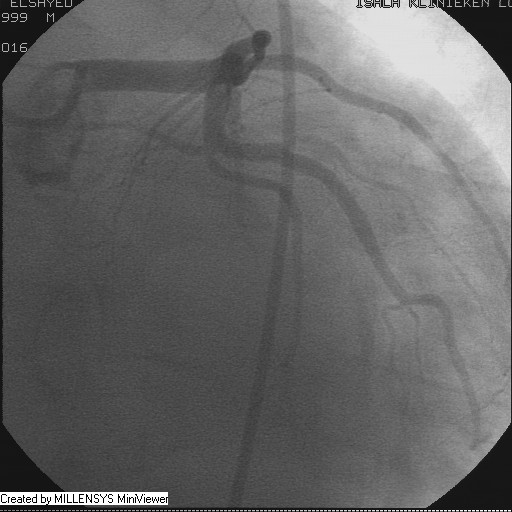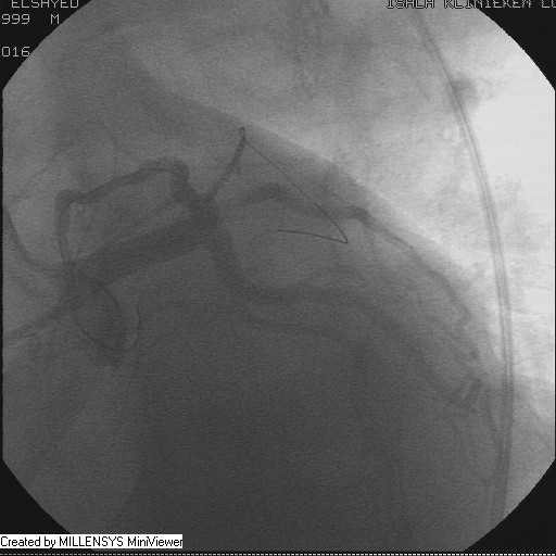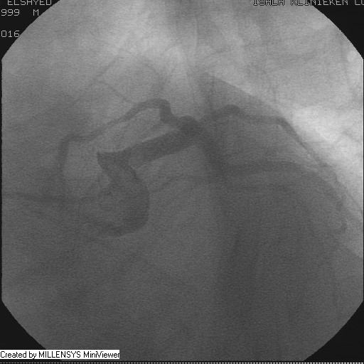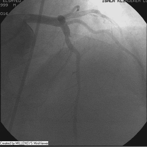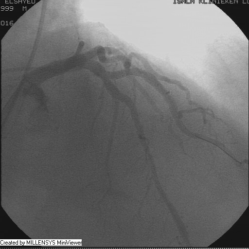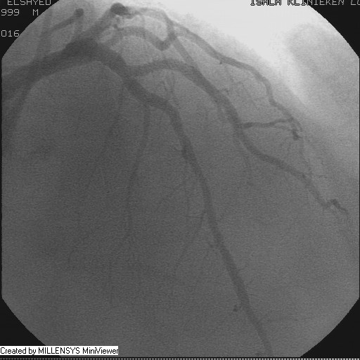 Patient transfered to Cardiac Catheterization Laboratory, coronary angiography showed atherosclerotic coronaries but without significant lesions, especially LAD that was patent with TIMI 3 flow (Figure 1- 5). Re-evaluation of the Angiography showed a small stump that can be for an occluded 1st diagonal (Figure 2a), at that level the LAD has a non-significant lesion.