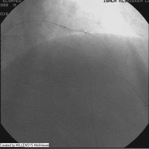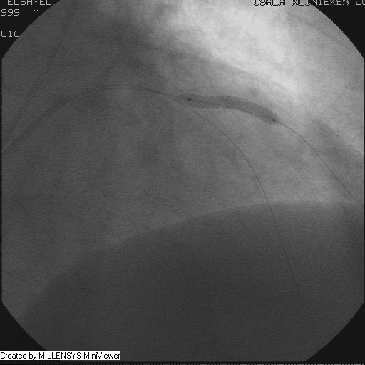 After crossing with the PTCA wire, a minimal flow started to appear in the diagonal branch (Figure 6), then LAD was wired, then a 2x15mm Balloon was used to pre-dilate (Figure 7,8), a big diagonal branch appeared with proximal thrombotic tight lesion (Figure 9), the diagonal angle to LAD was about 90 degree (Figure 10), so provisional stenting done to diagonal from its ostium with 3x20mm PROMUS ELEMENT PLUS DES (Figure 11,12), with good final result (Figures 13&14).