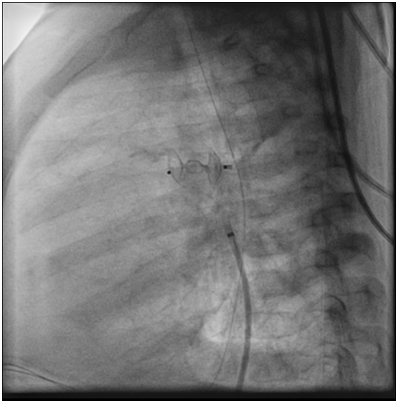 Left femoral vein was cannulated and 7Fdelivery sheath introduced. PDA amplatzer duct occluder 6mmx 8mm delivered and closed the PDA successfully. Follow up angiogram showed minor leak through the device (Figure 11).