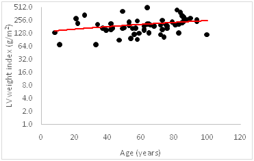 Where LVIDd: Left ventricular end diastolic diameter; IVSTd: Diastolic Interventricular septal wall thickness, PWTd: Diastolic posterior wall thickness.5 Relative wall thickness (RWT) was used to differentiate between concentric (RWT ≥ 0.42) and eccentric (RWT ≤ 0.42) hypertrophy.5 End: diastolic volume was calculated using Teichholz formula V= (7/2.4+d) x D3, where V = Volume and d = LV internal diameter. We calculated mass of blood contained in the LV cavity by multiplying end: diastolic volume with density of blood (1.06 g/m3 at 37 degrees Celsius).6 We added this mass to the LV mass to determine LV weight and LV weight index. Since the cardiac cycle is dynamic and the volume of intra cardiac blood varies continuously, the total cardiac weight is difficult to determine; thus, we used LV weight as a surrogate for total cardiac weight.