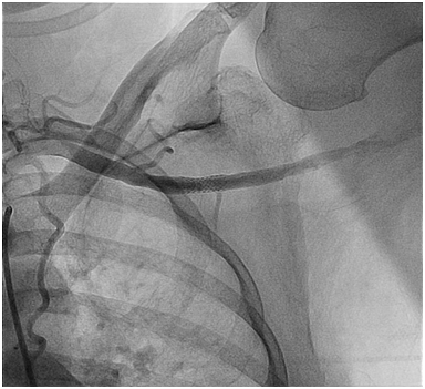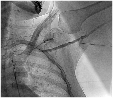 Figure 4A Axillary Artery access with micropuntcure needle utilizing roadmap guidance obtained by injecting contrast through a catheter advanced from R common femoral artery to the L subclavian artery.