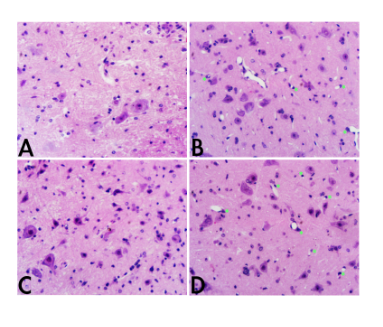 We decided the start day (E0) for treatment at the next day that paralysis scores become 2. Most of mice reached the peak of severest symptoms at 7th day after the start day (E7), the symptoms started getting mild after. We chose the 14th day after the start day as the end point of this study (E14). We studied the impact of Dexamethasone on the pathological changes of spine card in the process of outbreak of acute inflammation of spine cord through H&E staining.