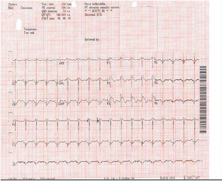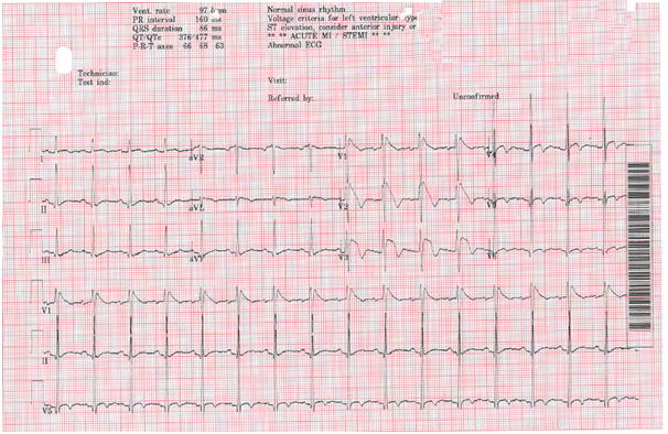 His initial ECG (Figure 1), showed sinus rhythm , RSR pattern in V1 And V2 with ST- elevation in V1 and V2 ECG. We were asked to see the patient as the ECG changes were interpreted as acute myocardial infarction. The ECG was later interpreted by cardiology staff to be typical changed of type 1 brugada syndrome, then asked to do ECG with higher position of v1,v2 (Figure 2) shows more pronounced changes(coved ST elevation) and (Figure 3) demonstrate the effect of normalization of body temperature with complete resolution of the ECG changes. The patient was admitted to cardiology monitored bed started on antipyretic medication as well as antibiotics, later he developed more fever and had recurrence of his ECG changes (Figure 4). He was counselled regarding the need for electrophysiological study, genetic counselling and need for defibrillator.