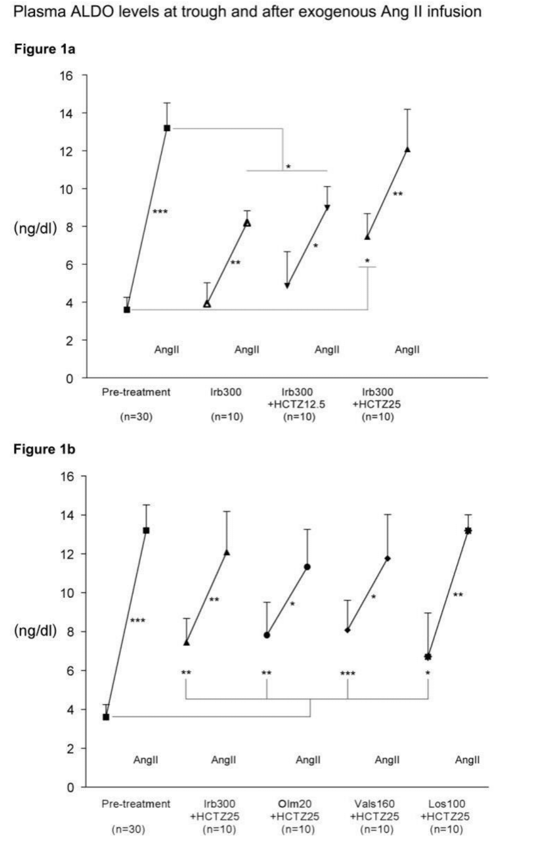 Methods: Thirty subjects participated in this randomised, controlled, single-blind study. The effect of a 1 h infusion of Ang II (3 ng/kg/min) on plasma ALDO levels were investigated in each volunteer before and after a 1-week single-blind administration of either irbesartan 300 mg alone or in association with hydrochlorothiazide (HCTZ) 12.5 or 25 mg. After one week washout period, volunteers were switched to olmesartan 20mg/HCTZ 25 mg or valsartan 160/HCTZ 25 mg or losartan 100/HCTZ 25mg for another week.