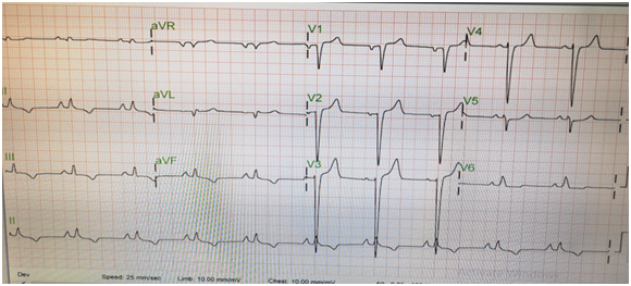 This is 34-year-old male patient presented to our hospital with 2 days history of dizziness and myalgia. Initially he denied any past medical illnesses. He is working at a company in the desert. Up on arrival his BP was 80/50, HR 160/min, ECG showed monomorphic ventricular tachycardia (Figure 1). While preparing for cardioversion, he received adenosine 6mg then 12 mg IV, then IV 150 mg of amiodarone but no response noted. He was sedated and first cardioversion was given. His rhythm converted to sinus (Figure 2). Due to the hypotension, he was resuscitated with IV normal saline. Then he developed dyspnea and desaturated in room air, required intubation and ventilation. He was put on amiodarone infusion. His initial work up showed the following Table 1.